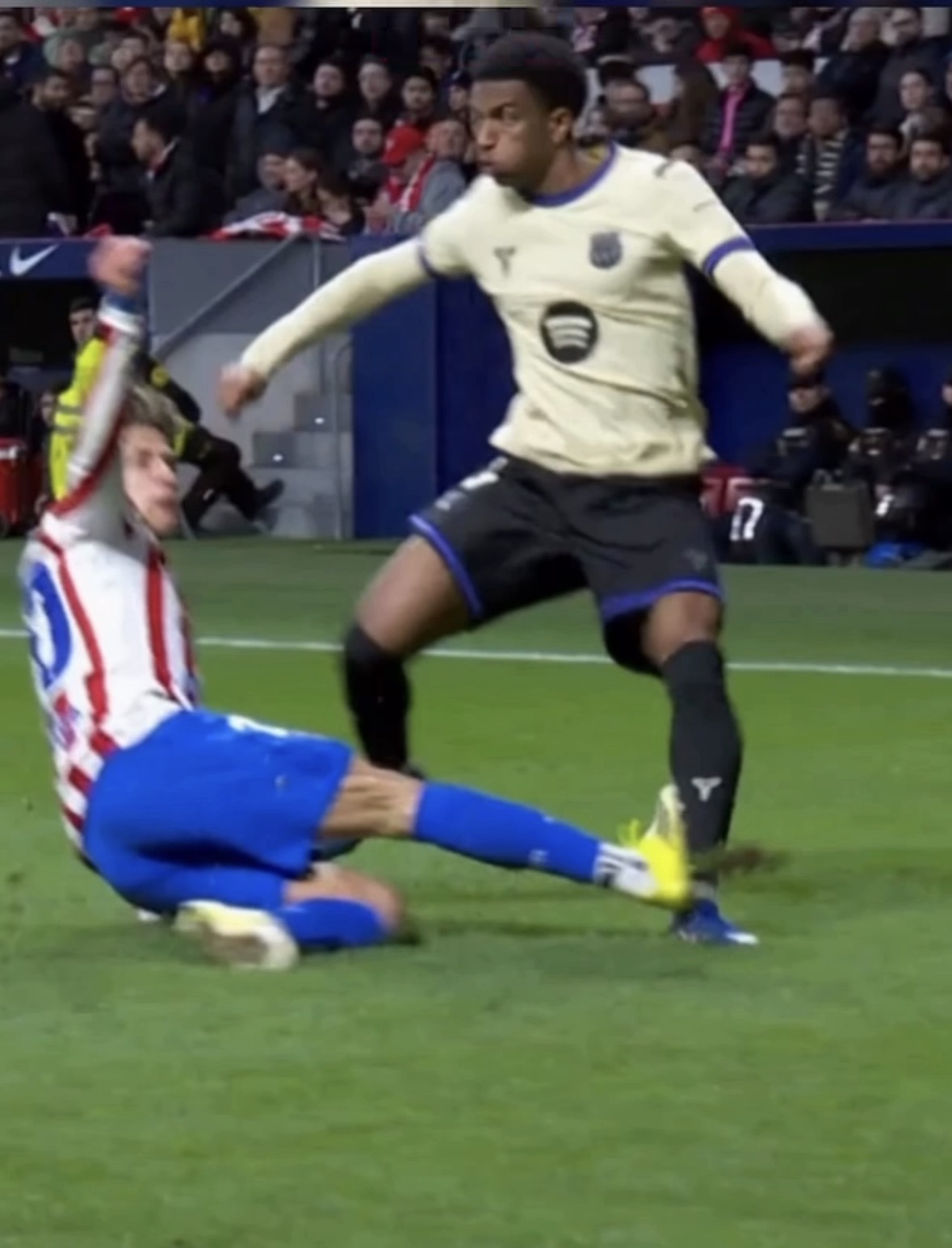 מה שאני התרשמתי זה שהמקרה עצמו לא דומה למקרה של דה יונג, כי מה שראיתי מההילוך החוזר היחיד הגלישה לא לכיוון השחקן עם הפקקים למעלה מה שציינתי בעבר שלפי ההנחיות זה אדום, הגלישה הייתה במקביל לשחקן במטרה ליירט את כדור הרוחב של בלדה ורק בהמשך הגלישה הייתה הפגיעה.